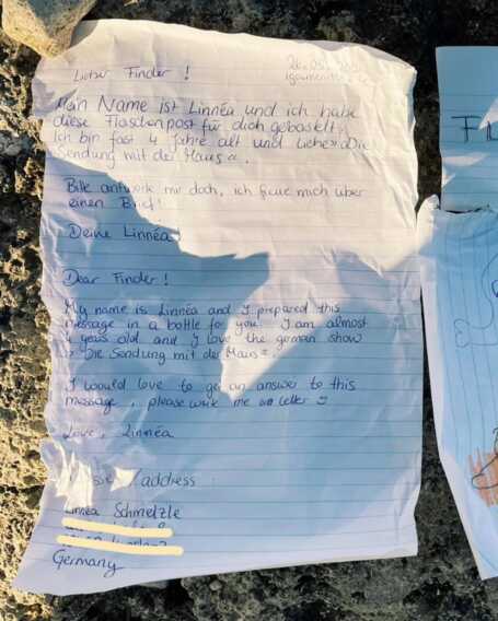 «Mi chiamo Linnèa e ho preparato questo messaggio nella bottiglia per te. Ho quasi quattro anni e mi piace il cartoon tedesco “Die Sendung mit der Maus“. Mi piacerebbe avere una risposta a questo messaggio, per favore scrivimi una lettera». È il contenuto di un messaggio, contenuto in una bottiglia di vetro, che il mare ha restituito sulla costa di Mola di Bari.