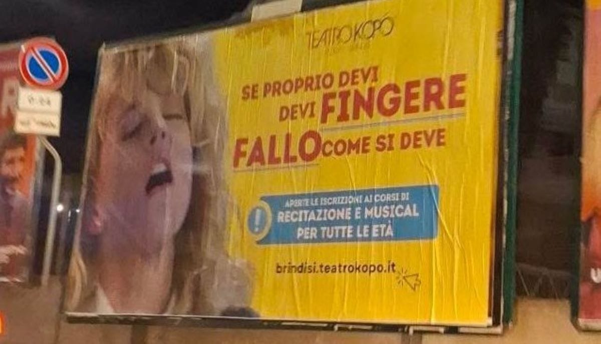 «Il cartellone pubblicitario con Meg Ryan che finge un orgasmo? Simbolo di potere femminile». È così che il teatro “Kopò” di Brindisi ha cercato di difendersi dalle critiche ricevute via social per una trovata pubblicitaria che sta facendo discutere. A sollevare il caso una giovane brindisina che, indignata, ha postato sui social delle foto ritraenti la nuova pubblicità del Kopò, taggando il teatro. «Se proprio devi fingere, fallo come si deve» si legge sul cartello, accompagnato dalla foto di Meg Ryan che finge un orgasmo nel celebre film “Harry ti presento Sally”. «Nel 2025 abbiamo ancora bisogno di questo per attirare gente e fare pubblicità?» ha chiesto la giovane al teatro sui social.