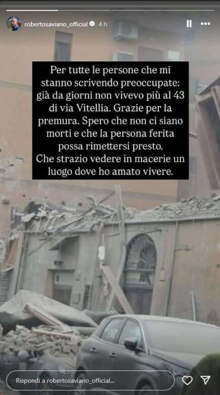 «Che strazio vedere in macerie un luogo dove ho amato vivere». Lo scrive sui social Roberto Saviano che fino a poco tempo fa viveva nella palazzina di via Vitellia 43, nel quartiere Monteverde a Roma, crollata a seguito di un’esplosione – probabilmente causata da una fuga di gas – che si è verificata stamattina.