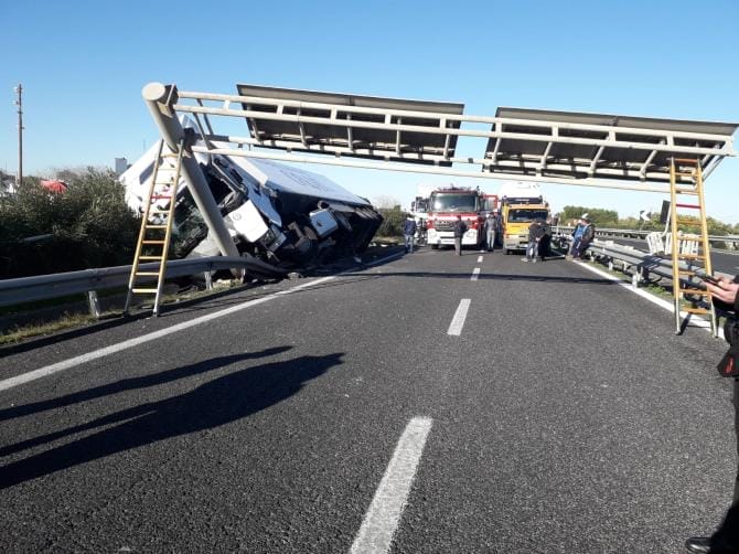 Lievemente ferito solo il conducente del mezzo che all’arrivo dei soccorsi era seduto per terra vicino al guardrail.