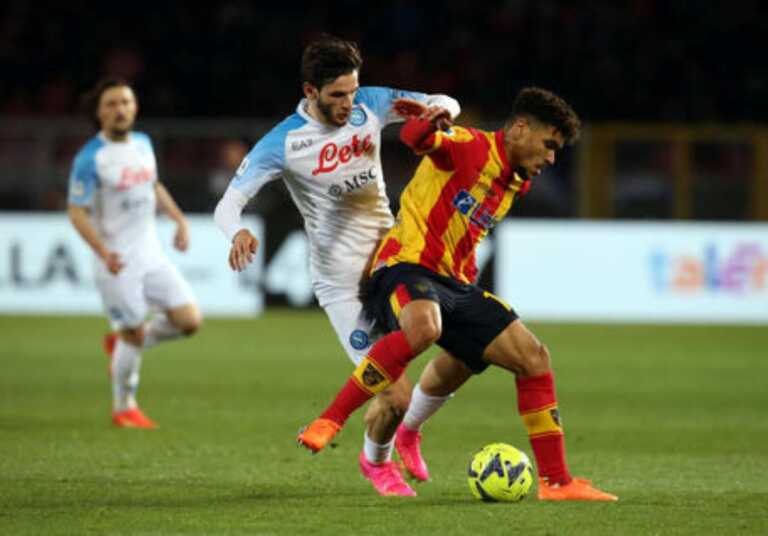 La gara parte con il Napoli che gestisce il pallone ma le prime occasioni del match sono di marca giallorossa: al 5′ Umtiti, di testa, non centra lo specchio della porta. All’8′ è Maleh che ci prova al volo con Meret che devia in angolo. Sugli sviluppi il colpo di testa di Baschirotto finisce di poco alto sopra la traversa. I partenopei sono più cinici e, alla prima occasione al 18′, trovano il gol con Di Lorenzo che, su assist di Kim, manda in rete di testa. Gol convalidato dopo il check del Var. Il Lecce prova ad alzare il pressing ma sono gli uomini di Spalletti a sfiorare il raddoppio, sempre con Lozano, in tre occasioni al 34′, al 44′ e al 47′. Il primo tempo si chiude sull’1-0 a favore degli ospiti.